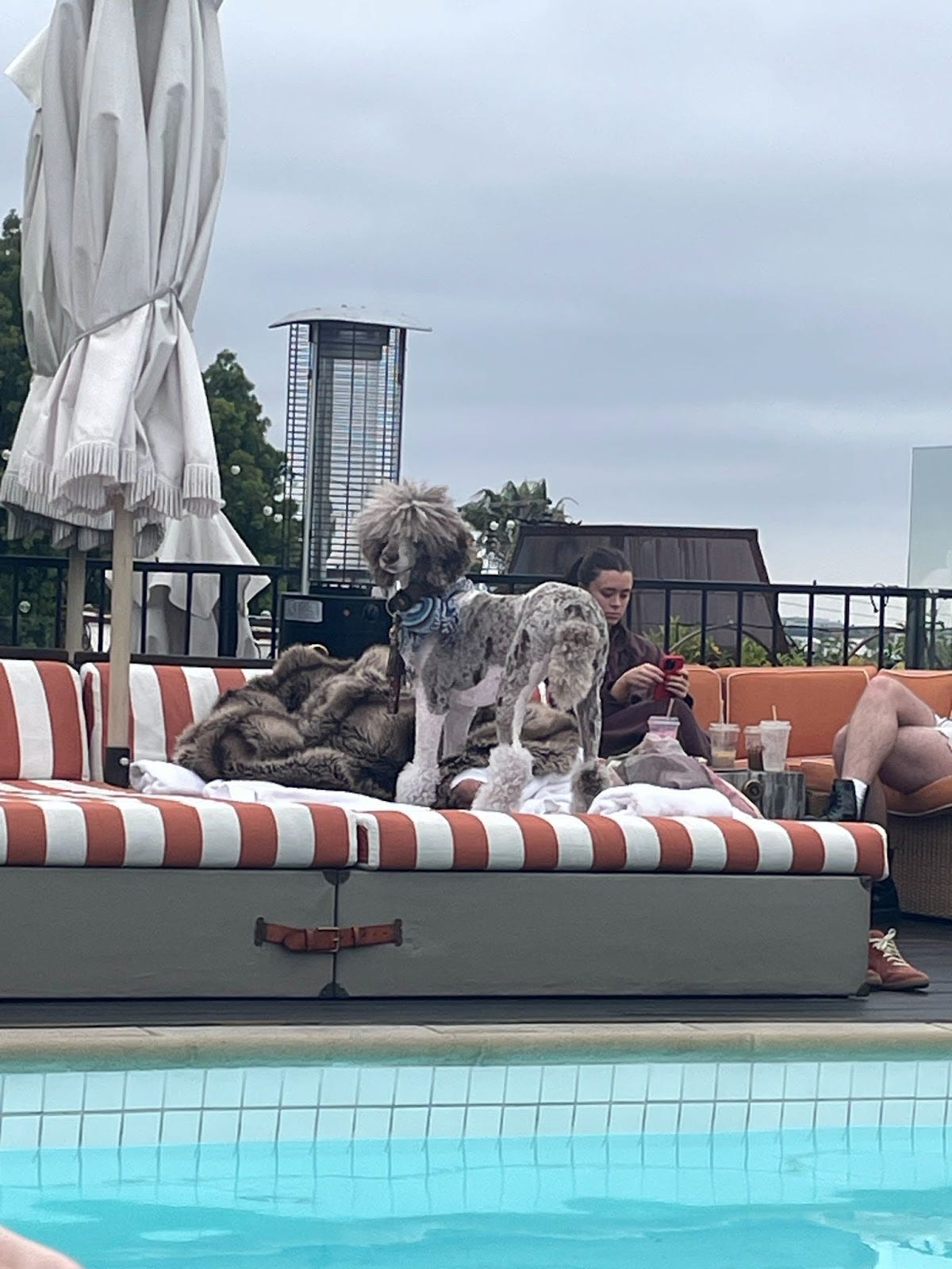 Poodle with curtain bangs at a hotel rooftop pool in L.A. to be paired with Portrait of a Lady by Frederic Malle.