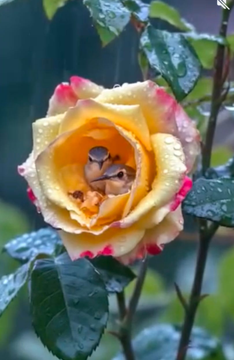 Two hummingbirds taking shelter from the rain inside of a flower to be paired with Venus in Tuberose by Universal Flowering.