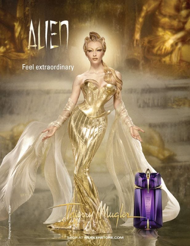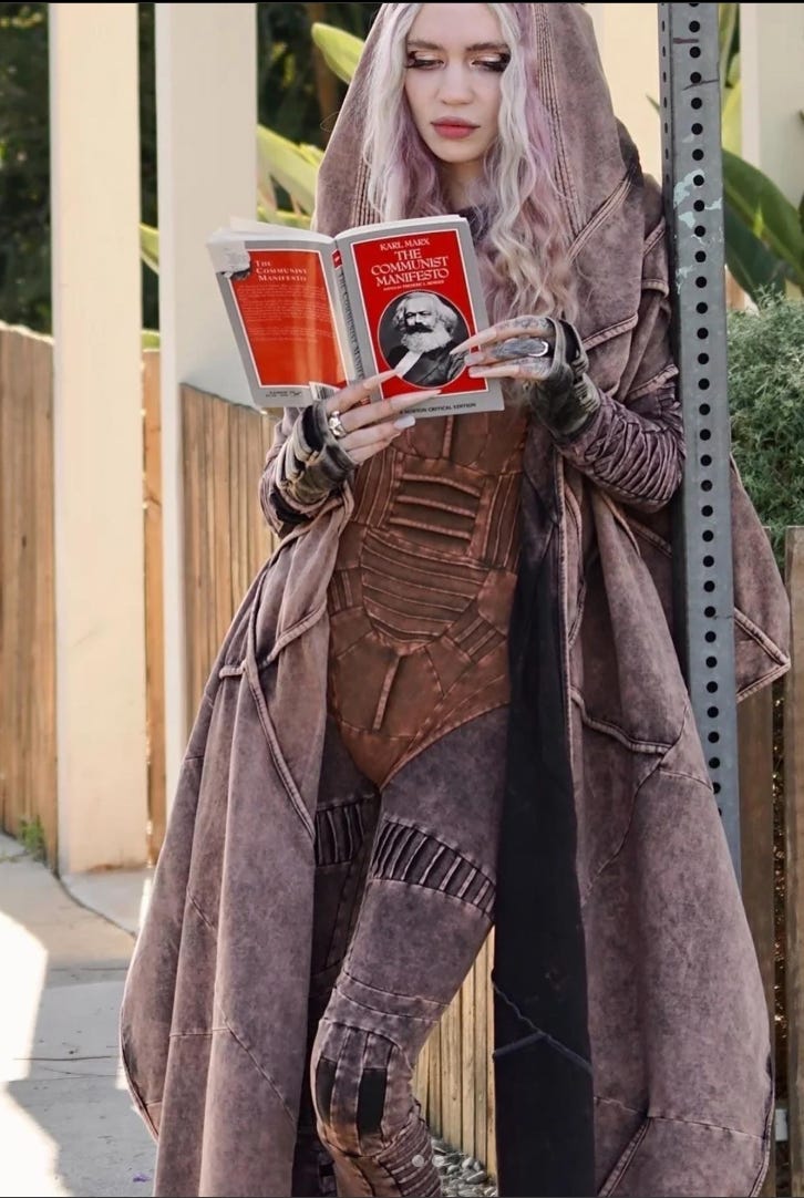 Grimes leaning on a street sign reading The Communist Manifesto paired with Mugler Alien.